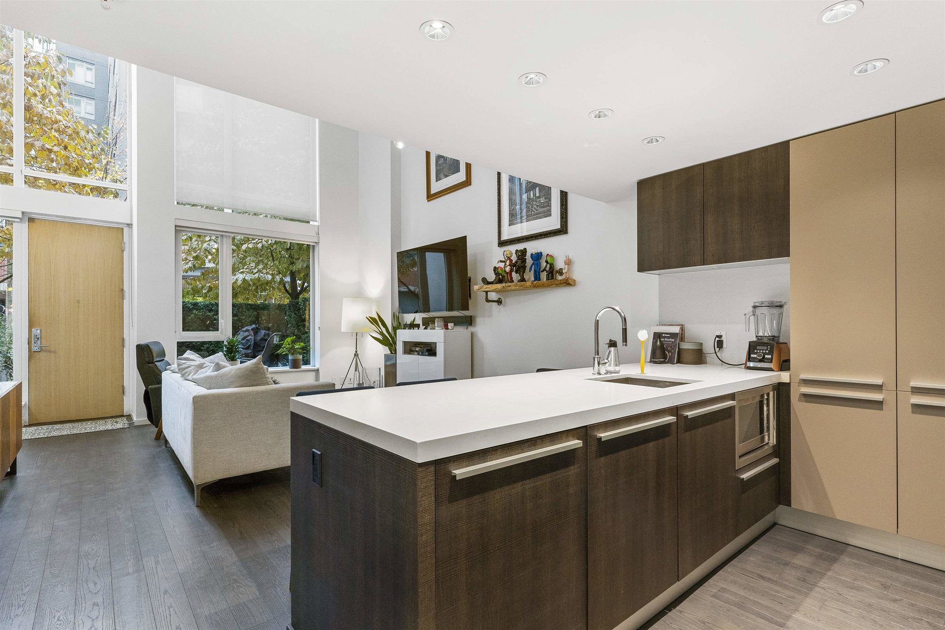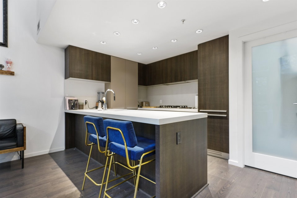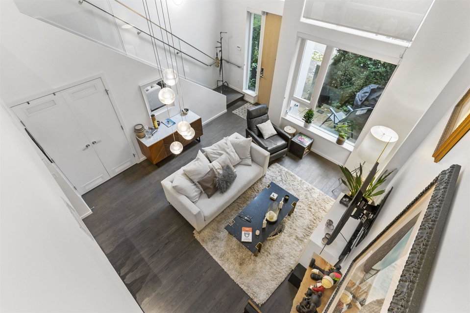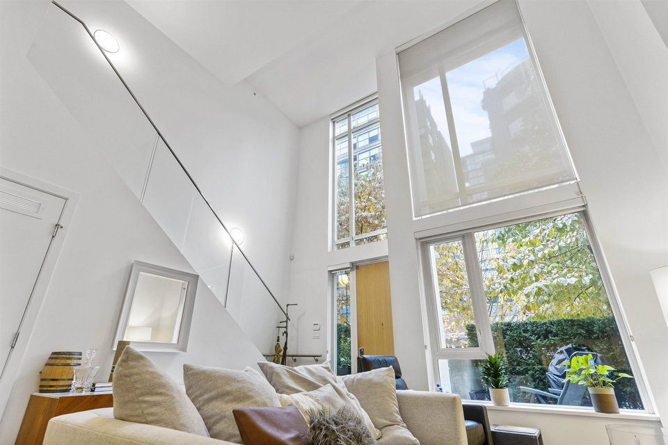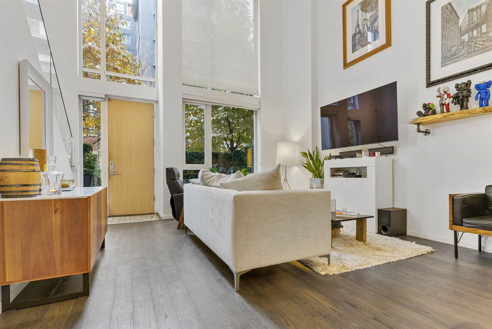 A unique and rarely available loft style street access Townhouse just steps from our world famous seawall, parks, coffee shops and everything that the close by BEACH DISTRICT has to offer. An end unit home with towering 18′ ceilings and massive floor to ceiling windows that drench the space in natural light. Sleek, modern and luxurious Italian cabinetry in the European inspired open concept kitchen that includes a gas range, built in oven and hidden fridge. Separate spacious storage that easily converts to that home office we could all use. Walk up the modern staircase flanked by seamless glass to the primary bedroom with ample closet space and a 4 piece bath that overlooks the living area. 24hr concierge, secure parking and storage locker included. OPEN HOUSE SAT/SUN OCT 30/31 12-2PM
